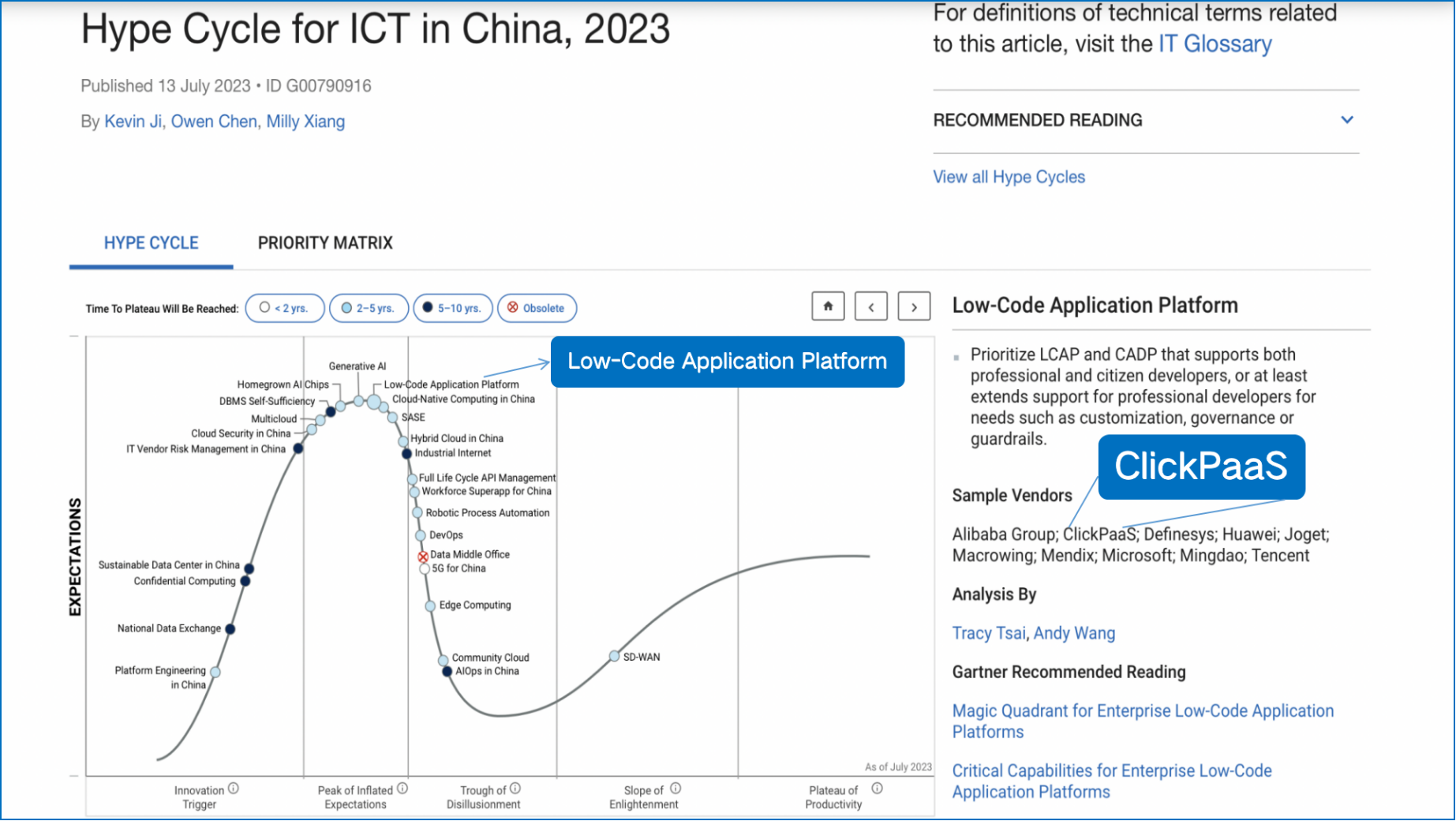 近日,国际权威研究机构Gartner发布了《Hype Cyple for ICT in China,2023(2023年中国ICT技术成熟度曲线)》报告,long8国际唯一官网凭借平台的aPaaS+iPaaS+DaaS保障业务系统的一站式设计,多租户、热发布、国际化、信创安全等特性实力登榜,并作为低代码PaaS平台代表厂商TOP2入选本次报告。